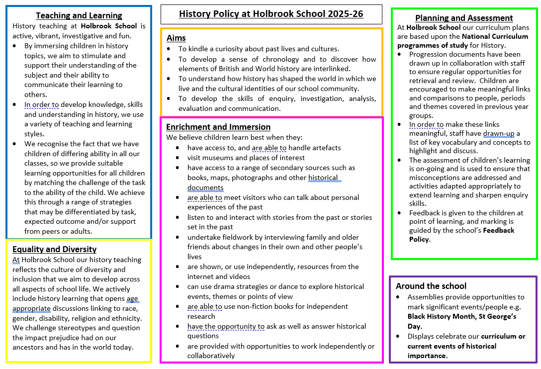 Children leave Holbrook with a good knowledge and understanding of Britain’s history and that of the wider world, as well as the historical skills to understand the past. They will have visited a number of places of local and national historical interest. Children confidently talk about people, events and periods of history they have learnt about, and comment on how these have had an impact. They are able to use primary and secondary sources and make inferences about the past from these, understanding that perspective can affect the evidence.