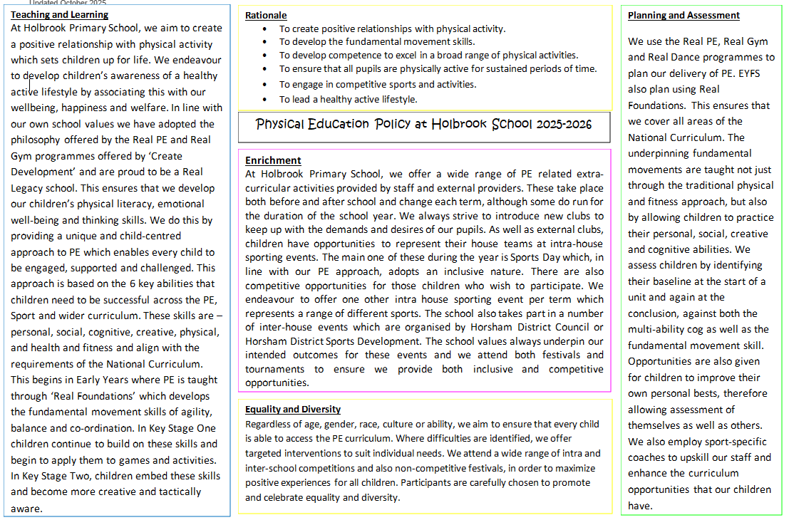 As a result, children leave Holbrook with physical literacy, emotional and thinking skills to be able to achieve in PE, Sport and life.