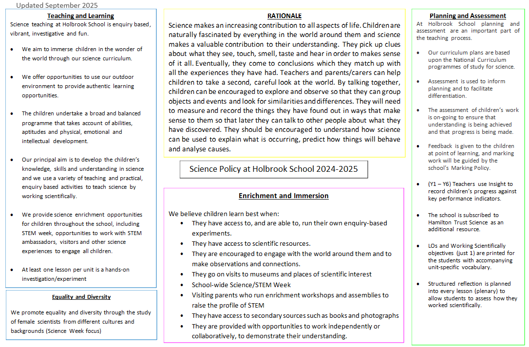 At Holbrook, we have constructed a science curriculum that is ambitious and designed to give all learners the scientific knowledge and skills necessary for our modern world. Our curriculum is carefully planned and includes a progression of skills which ensures a development in each year’s learning, meeting the expectations of the National Curriculum and setting our students up for success as they progress to secondary school and beyond. We strive to include all learners, from those with SEND to the most able through engaging, hands-on scientific learning.